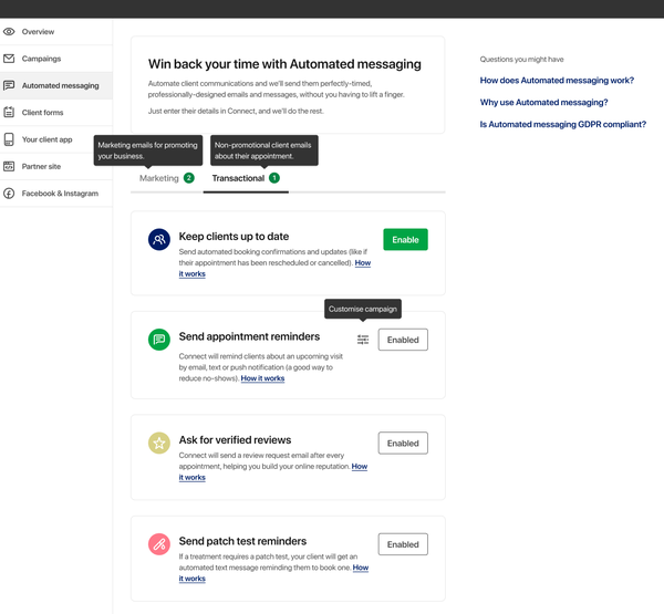 Treatwell Connect • 15th February 2021 Web copy: Feature page Automate client communications and know they'll always get perfectly-timed, professional emails and messages – without you having to lift a finger.
